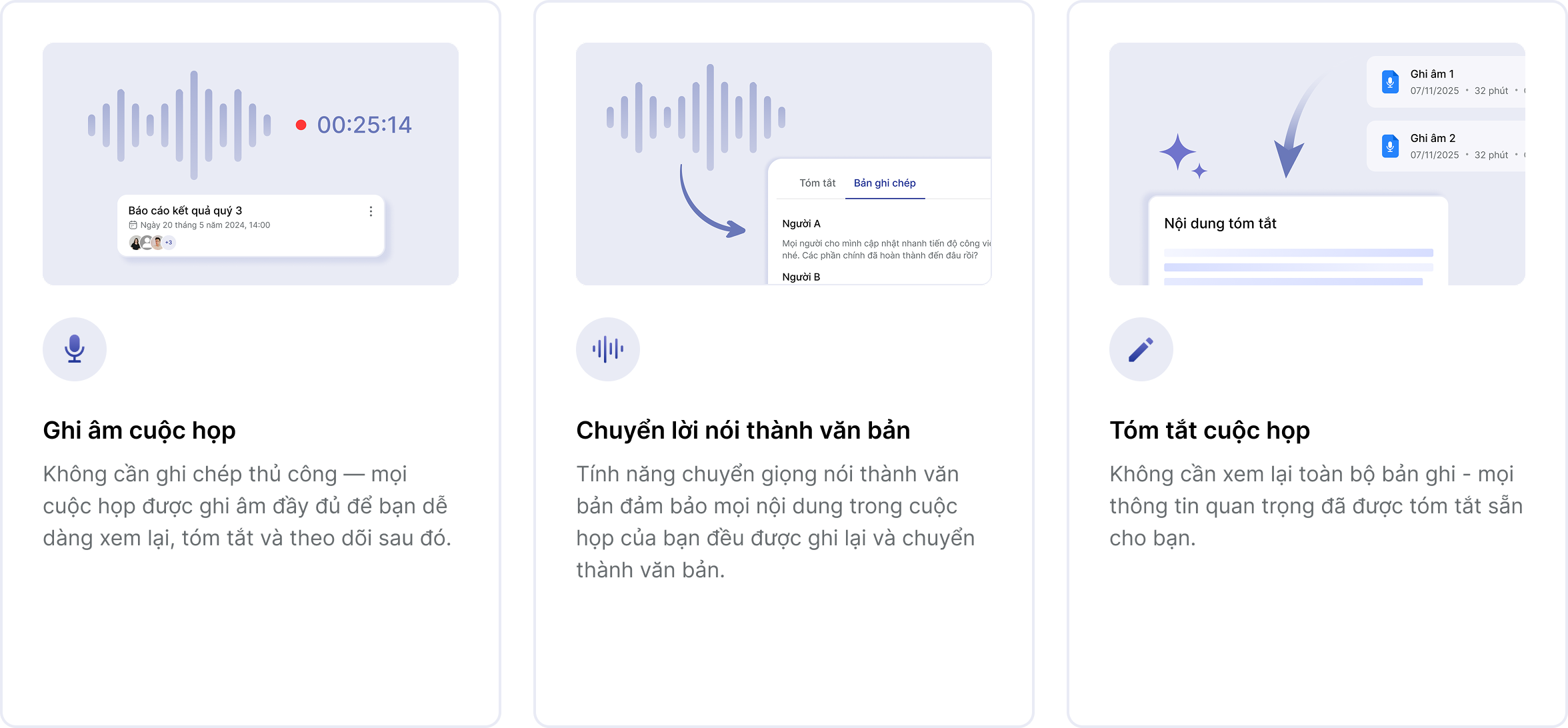 ghi âm đến tóm tắt thông minh, AI tự động tổng hợp, tóm tắt những nội dung để bạn không bỏ lỡ bất kỳ thông
